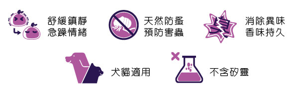 薰衣草本身具有抗菌及消炎效果,是「芳香療法」(aromatherapy)主要原料之一,由薰衣草提煉出來的芳香精油是所有芳香精油中治療用途最廣的一種 。薰衣草香味對神經系統產生作用,具調整平衡身心 的力量,並能減少蚊蟲叮咬,而毛寶為了吸引異性需要分泌賀爾蒙,使體味明顯變重,情緒變得騷躁不 安,這是市面上唯一一款能照顧到毛寶貝身、心、靈 的多效合一產品。