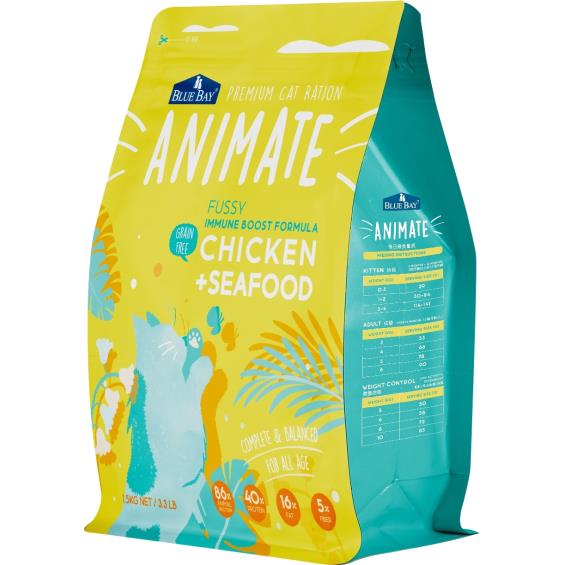 去骨雞肉、綜合海鮮(鮪魚、鯖魚、沙丁魚、台灣鯛、虱目魚、干貝)、青豌豆、鷹嘴豆、蔬果膳纖(甜菜纖維、南瓜、薏仁、山藥、蔓越莓、番茄、蘋果、胡蘿蔔、黑木耳) 、樹薯纖維、植物油脂(大豆油/生育酚保存)、鱈魚油、雞油、水解蛋白(鮭魚)、有機冷壓椰子油、有機雞蛋、綜合礦物質、L-離胺酸、綜合維生素、酵母粉(含MOS)、海藻粉(褐藻)、絲蘭萃取物、綜合消化酵素(蛋白酶、脂肪酶、澱粉酶)、牛磺酸、鱉蛋粉、益生菌(啤酒酵母菌、植物乳桿菌、枯草芽孢桿菌)、靈芝多醣體、褐藻糖膠、接骨木苺萃取物、綠茶萃取物